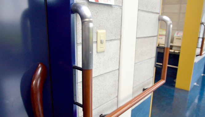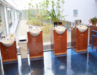 車椅子利用者を初め、自分の使いやすい洗面台を選べるよう、高さを変えた洗面台を設置しています。手すり付き洗面台もあるので、杖を利用する方も安心です。