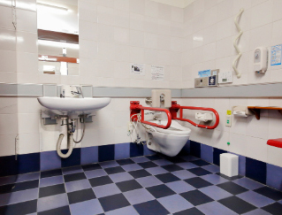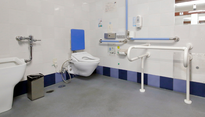 それぞれの障がいに合ったトイレを選べるように、個室別で便器や洗面台の配置を変えています。また手すり、補助具なども設置されています。