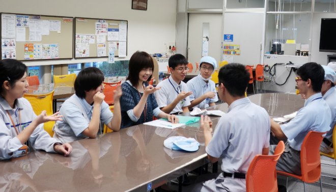 週に3回、就業前に手話教室が開催され、希望者が参加しています。昨年は、「指文字」を学習する手話検定7級にチャレンジし、見事全員合格しました。聴覚障がい者とのコミュニケーションの手段が得られるだけでなく、サークル活動として社員交流の場にもなっています。