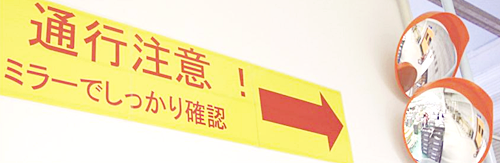 通路の曲がり角でぶつからないようにミラーを設置しています。また車椅子の方でも見えやすいように、低めのミラーも別途設置しています。